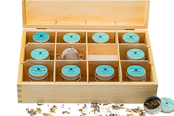 Loose Leaf Tea Sampler Gift Set. Enjoy a cozy cup of tea with this beautifully crafted wooden tea box featuring 30 premium loose leaf tea samples. Designed for exploration and enjoyment, this curated collection invites you to discover a wide range of flavors and aromas at your own pace. Each mini tin holds a unique blend from Tea Time in Cayman, offering a thoughtful variety of black, green, white, oolong and herbal teas to suit every mood and moment.